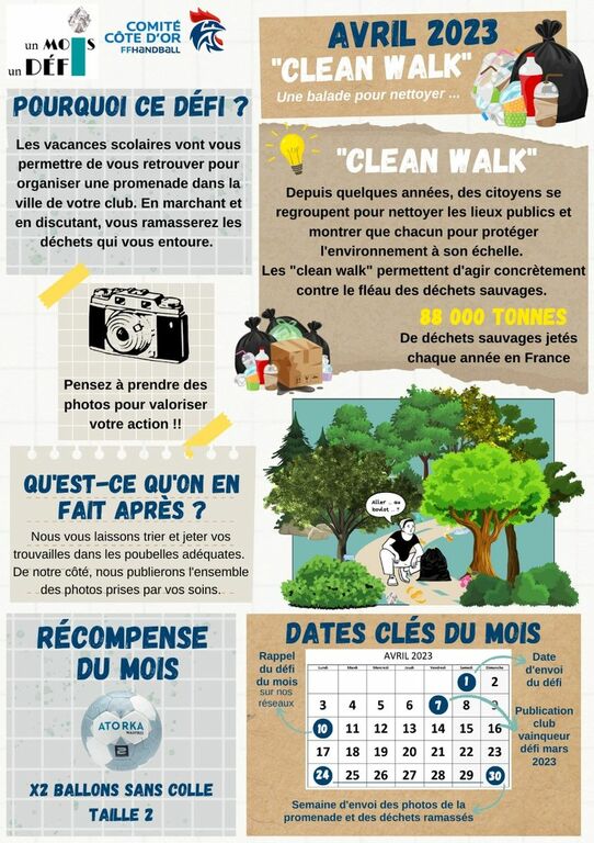 Avec l'arrivée du printemps, le Comité vous propose d'organiser avec vos licenciés une "CLEAN WALK" Pour une plus belle et plus verte, ramassons le plus de déchets.